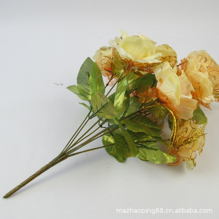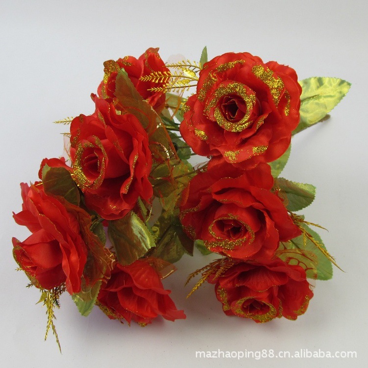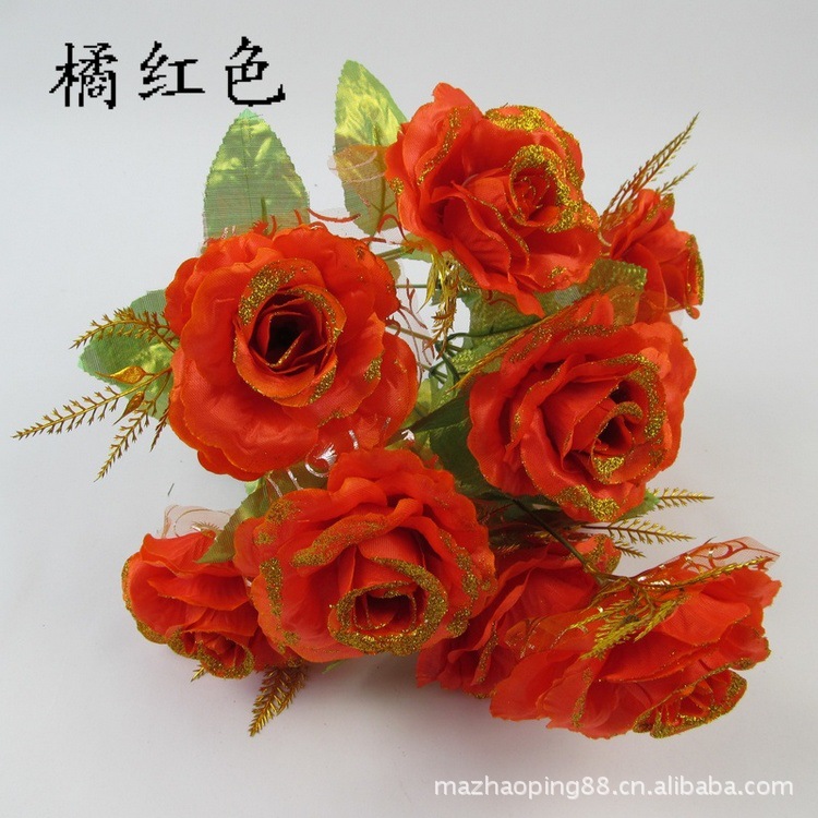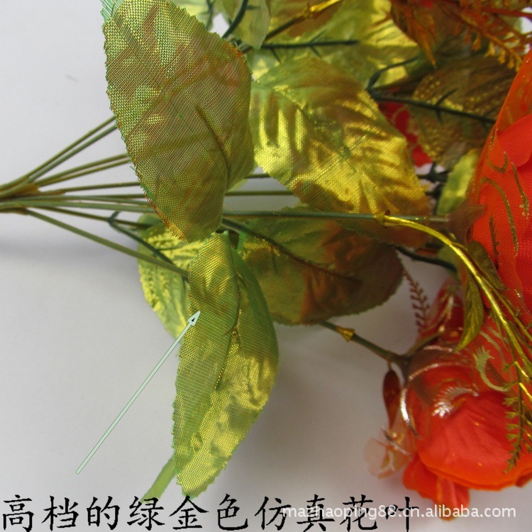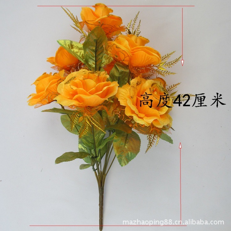规格;高40-42 厘米,花头直径9厘米,10 头枝干。沾金带纱。