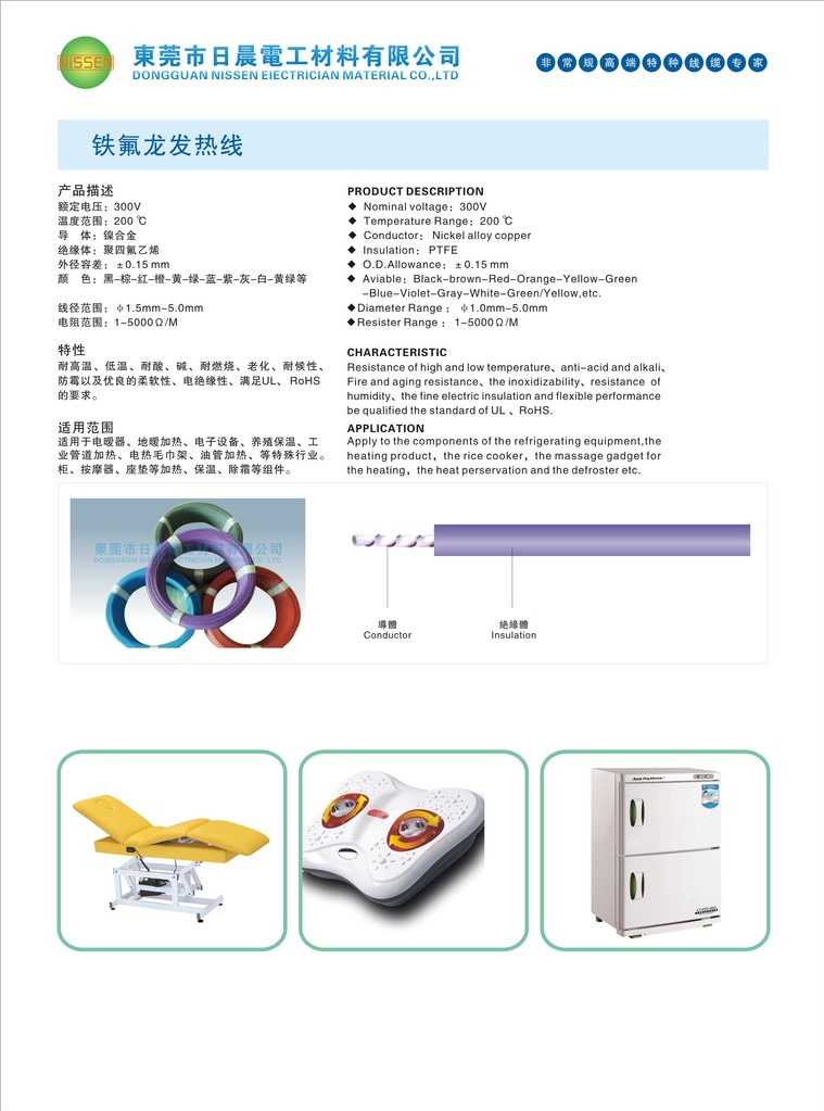 东莞市日晨电工材料有限公司,经营各种IEC、UL、CSA、VDE、CCC、REACH、SVHC、CQC、RoHS和SGS承认合格的铁氟龙电线、硅胶电线、发热线、极细电子线、仪器仪表线、高温绝缘套管和线束加工制品等电工材料。公司产品采用高纯度无氧铜、绿色环保材料,是符合电工标准又环保的电工材料专业供应商。日晨产品受到国内外广大客户的欢迎。