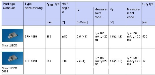 IR红外发射器产品包含了具有230 mW/sr发射强度贴片封装的器件. 可广泛应用于安全系统, 汽车泊车传感器, 手机, 数码相机, 摄像机.