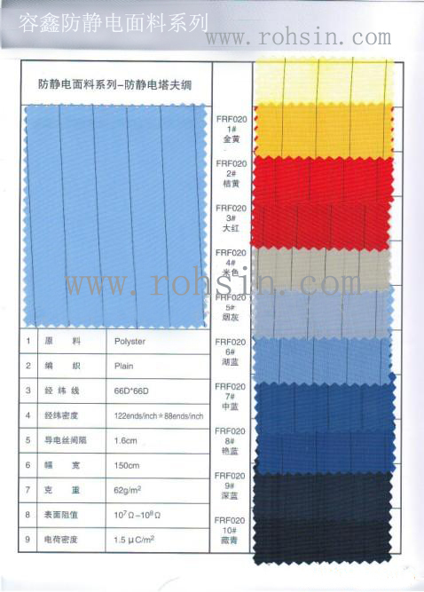 采用不锈钢纤维、亚导电纤维、防静电合成纤维与涤棉混纺或混织布,能自动电晕放电或泄漏放电,可消除衣服及人体带电,同时供防静电的帽子、袜子、鞋。其性能指标符合GB12014-89标准:布料电荷密度≤5μC