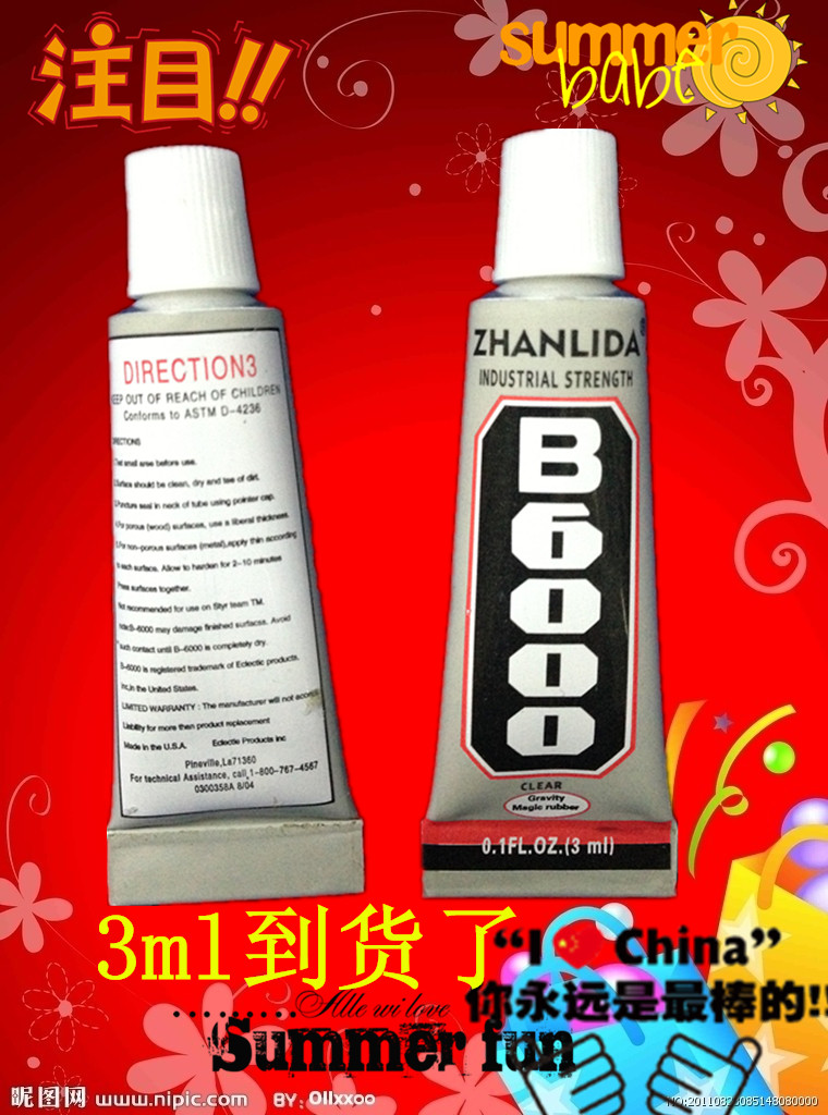 B6000自流平胶粘剂是一种可满足玩具,花类,饰品。工艺品等行业粘接的特殊环保胶剂,与其它胶粘剂相比,B6000刺激性的气味微小而且还有澹澹清馨香味;属于单组份新型透明溶液胶,室温固化,操作方便不需重新分装,开盖既可使用。具有高弹性,胶膜柔软,防振动和防水。B6000胶粘剂可粘贴更多的材料,它对金属、玻璃、陶瓷、石材、竹木材、布料、皮革、PE、PP、PVC、ABS、尼龙、海绵、薄膜、织物、电子元件、塑料类、橡胶类、纤维类、纸张类,和其它材质都有很好的粘贴性能。