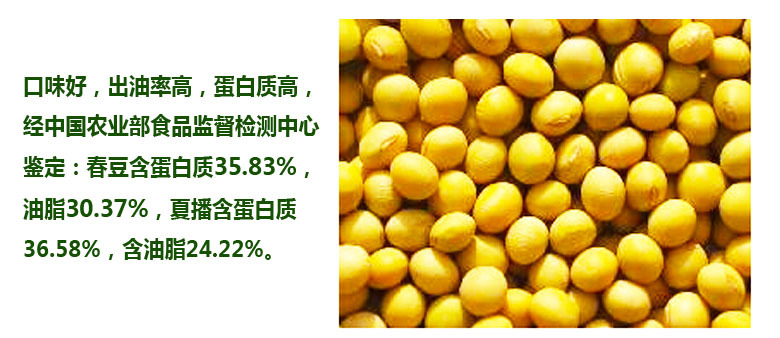 鑫豆1号品质高,口味好,出油率高,蛋白质高,经中国农业部食品监督检测中心鉴定:春豆含蛋白质35.83%,油脂30.37%,夏播含蛋白质36.58%,含油脂24.22%,属高蛋白高油优质大豆品牌。