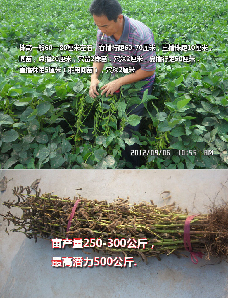 株高一般60—80厘米左右,春播行距60-70厘米,直播株距10厘米,间苗,点播20厘米,穴留2株苗,穴深2厘米,夏播行距50厘米,直播株距5厘米(不用间苗),穴深2厘米,春豆生杈较多,夏豆偏少,大圆叶,紫花,不用打顶芯,自动封顶,荚皮棕色,有三粒、四粒荚,粒黄色,黑花脐,花期春豆50天左右,夏豆30天左右,亚习性,有限结荚,稳定性能好,抗旱抗涝,抗倒伏,抗多种病虫等,耐肥水,耐用重茬,无地黄病,无菟丝子。出豆油、豆饼产量高,适应大面积种植。