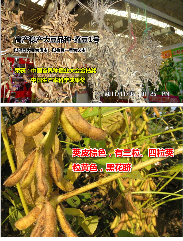 高产稳产大豆品种-鑫豆1号,以巴西大豆为母本,以鲁豆一号为父本,经多年精选育成。经农业部食品质量监督检验测试中心鉴定:春豆含蛋白质35.83%,夏播大豆含蛋白质36.58%,含油脂24.22%。通过国家专家审定和北京市品种审定委员会审定。荣获中国首界种植业大会金枯奖,荣获中国生产率科学成果奖。