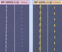 | 点状缝作为低成本且生产性能高的装饰缝,可用于男装的里襟、西裤的前门襟、口袋、侧缝等的装饰缝。还能对应衬衫、罩衫等襟边装饰缝及针织商品等多样化的素材,扩大了工序。MP-200N新设了可对应宽幅、粗线的新规格,可广泛对应从细幅到宽幅的各个范围。 |  |
