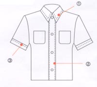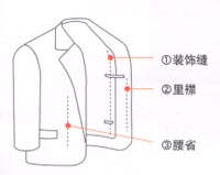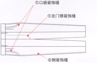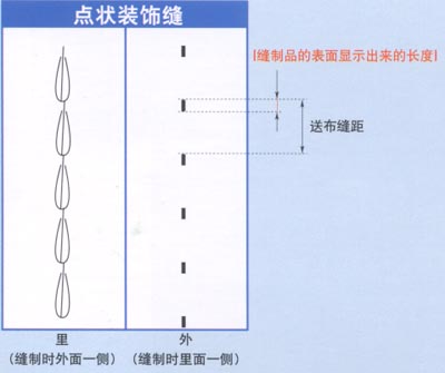 *缝制品表面显示出来的长度,会由于面料缝制 条件的不同而有所差别。针幅会缩短0.5mm左右。 点状装饰缝用途 | ●绅士服上衣以及夹克衫 ①领驳装饰缝 ②里襟、腰省缝(防止错位) | ●西裤 ①前袋口以及左门襟装饰缝 ②侧装饰缝 | ●其他 ①大衣、女装、针织衫等襟装饰缝 ②大衣、女装、衬衫等的门襟装饰缝 ③大衣、女装、衬衫等各种装饰蜂 |