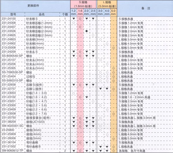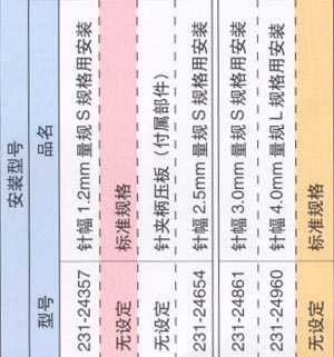 ■选购件 ●偏心轮(麦果) 型号 | 挑线杆相位 | 规格 | 效果 | 231-21106 | 标准 | 标准相位(标准装备品) | — | 231-21205 | 标准-10° | 比标准快了10°型 | 与标准相比系线紧 | 231-21304 | 标准+10° | 比标准迟了10°型 | 与标准相比系线松 | 231-21403 | 自由设定 | 在轴部没有平部的挑线杆相位可自由设定型,只是与挑线杆相位同样针杆行程也要变化 | — |
