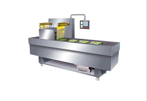 先将产品放在托盘里,再将托盘放入设备的放料区,托盘随着链条的向前运行进入到封口模具里,模具上升,在封口模具里将上膜附在托盘上,先抽真空、(可根据用户产品包装要求,在抽真空的基础上,充氮气或混合气体进行包装)封口、(上膜和托盘封在一起)冲切,最后排气,降模,包装好的产品随着链条继续向前运行,从出料口出料。设备还附加了光电跟踪对齐彩膜系统,为用户节约成本,提高生产效率,提高包装档次。配置废弃边料回收系统,保持环境卫生。还可以根据用户产品包装要求,配备自动打码系统。我们公司有一流的售后服务能力,以解决用户的后顾之忧。