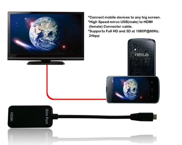 Nexus4专用slimport-HDMI转接器/高清高速micro usb(公) to hdmi(母)SlimPort产品基于DisplayPort技术,是从智能手机或平板电脑向大屏幕发送高清2D和3D视频和音频的一种简便方式。只需将一根移动USB电缆连接到任何一台电视机的现有端口即可,即插即用,不会牺牲移动设备的电池寿命。