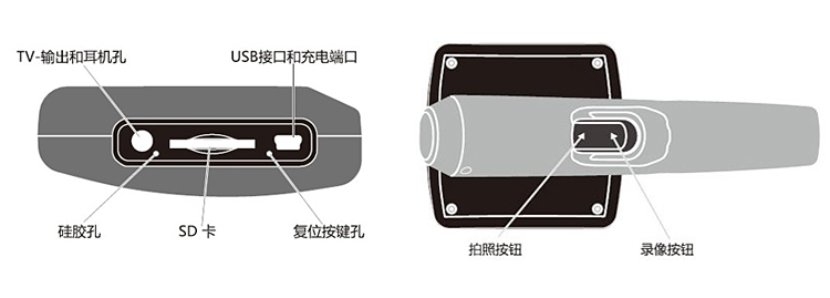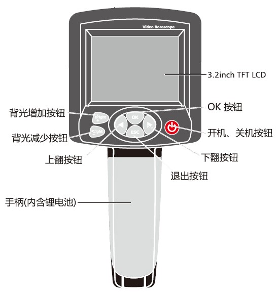 1、电源开关:按住电源键3~5秒启动机器进入图像/视频取景模式;再长按3秒钟关机。 2、调节CMOS亮度:在照相模式下,每按一次Bright+按钮LED增加背光亮度,且在显示屏有提示当前的亮度等级;每按一次Bright-按钮减少背光变黑暗。变亮和变暗循环(10代表最亮,0代表最暗;当为0时LED熄灭) 3、旋转图像:按上/下键可调节显示屏显示的角度,当我们的摄像头伸入管道在显示屏上显示的是180度图像时,可按这两个键把图像调到0度在显示屏上显示,方便查看物体。 4、照相:每短按一次“SNAP”键储存一张图片。(在System setup ime 菜单下打开日期/时间,照片将显示当前日期和时间;照片阅览器可在本机System setupExplorerPicture view菜单下浏览这些照片) 5、视频:按住RECORD键3秒进入视频,在屏幕左上方会显示视频符号闪动(表示正在录像中),在左下角显示多变的自由储存,然后长按“RECORD”键储存视频。(视频文件可在本机System setupExplorervideo player菜单下播放) 6、在摄像模式下按“OK”键会弹出一个对话框,按左、右方向键选择到“YES”再按“OK”键就会出入到系统设置界面。 |  |