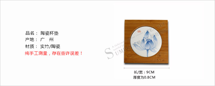 品名 | 陶瓷杯垫 | 货号 | 陶瓷杯垫 |  | 产地 | 潮州 | 材质 | 陶瓷 实竹 | 工艺 | 手工 | 耐热 | 耐高温 | 规格 | 详情请见尺寸图(具体以实物为准) | 颜色 | 以实用为准(由于拍摄受光线等影响,色彩仅为参考) | 组件 | --- | 制作工艺 | --- | 备注 | 该产品已将优惠加入,谢绝议价! |