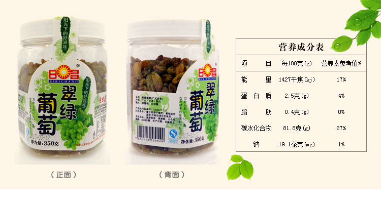 粒粒精选,美味天成 原料精选自新疆的葡萄,由于阳光不能直接照射到荫房里,所以晾干以后葡萄依旧保持原来的颜色,成为半透明的翡翠般的葡萄干,不含任何添加剂和色素,是新疆著名的特产之一。