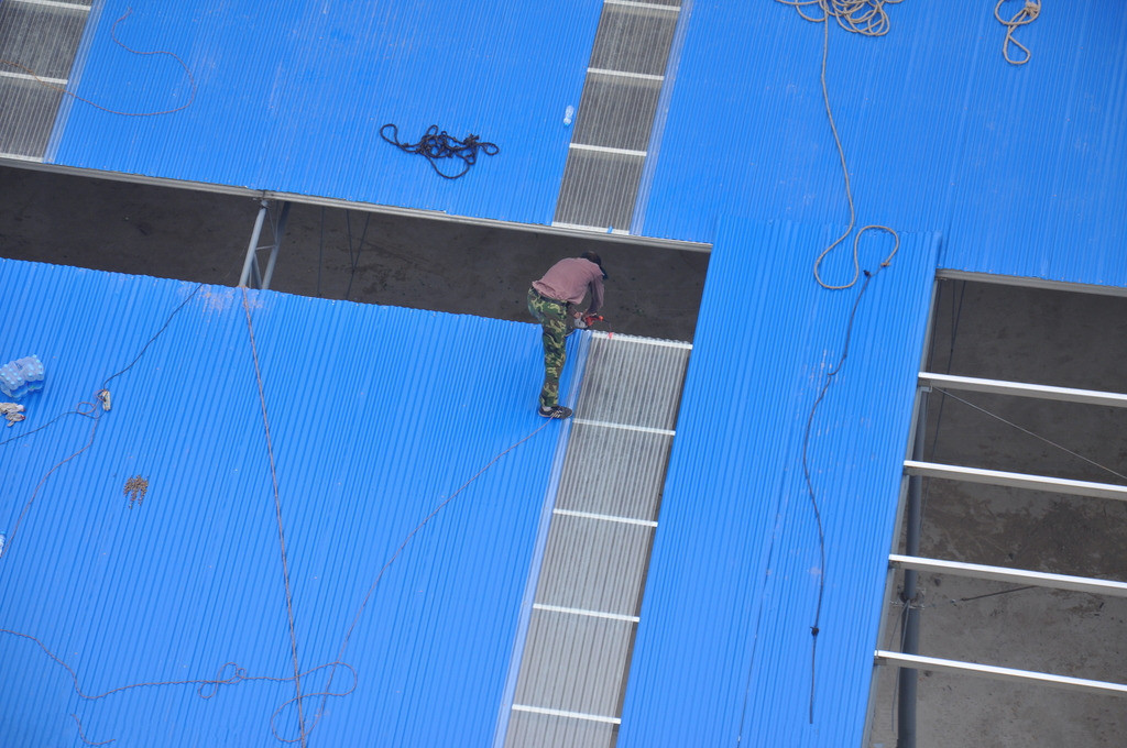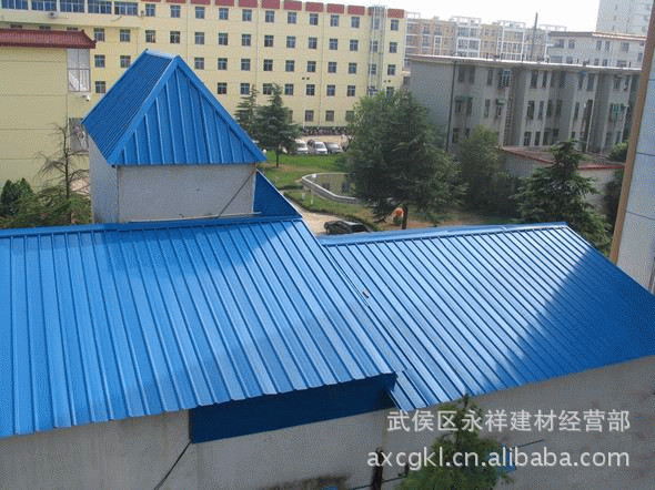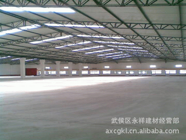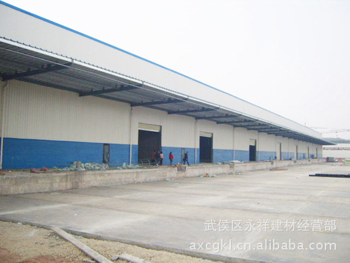 成都永祥彩钢钢结构厂房仓库大棚,彩钢瓦屋面,构造主要分以下几部分:1.预埋件(能稳定大棚结构)2.立柱.一般用直径100mm-300mm的钢柱或H钢。3.梁.一般采用方钢焊架或C型钢H钢(中间积的高度根据梁的跨度来定);4.横梁一般采用C型钢.架子上面盖彩钢瓦。彩钢瓦分单层瓦和夹心瓦(两层瓦中间搁着泡沫起到冬暖夏凉的作用,也有隔音的效果)。彩钢瓦以彩色镀锌钢板经数控设备辊压成型的新型建筑材料,轿车漆工艺镀锌烤漆处理的彩板。烤漆附着力极强,二十年无需维护。具有建造时间短,造价低廉,实用,等特点。昨日秦汉砖瓦,今日永祥彩钢!
