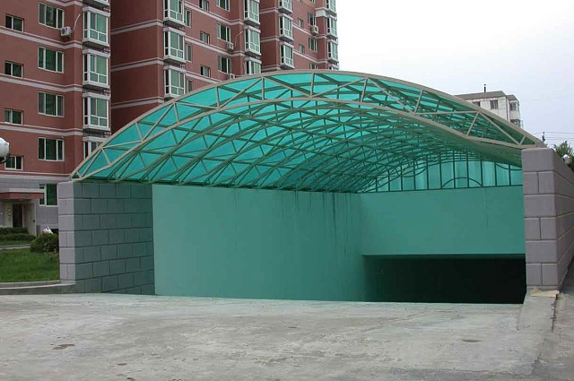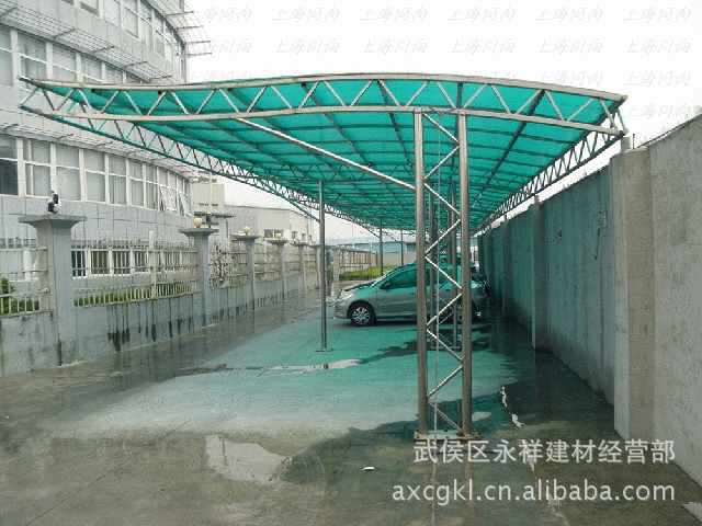 成都永祥不锈钢钢结构pc阳光棚,阳光板停车棚 阳光板雨棚,棚面采用pc阳光板,结构采用优质不锈钢焊接。具有抗冲击性强,透明度高,结构稳定,美观大方的特点。适用于各种候车棚、休闲棚、停车棚、市场大棚商场 凉亭 休息厅 走廊的采光雨棚及小区屋顶采光房、办公大楼、百货大楼、宾馆、学校、医院、工业厂房等建筑采光。