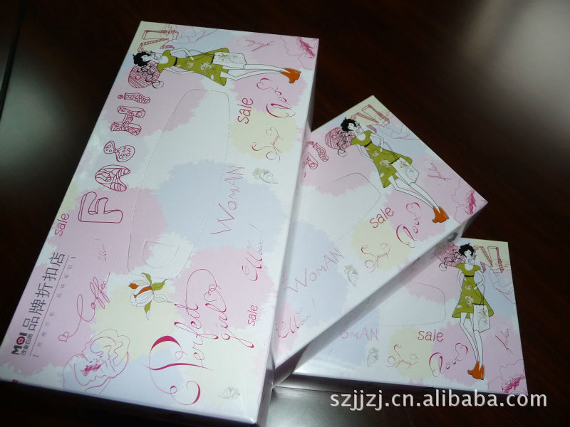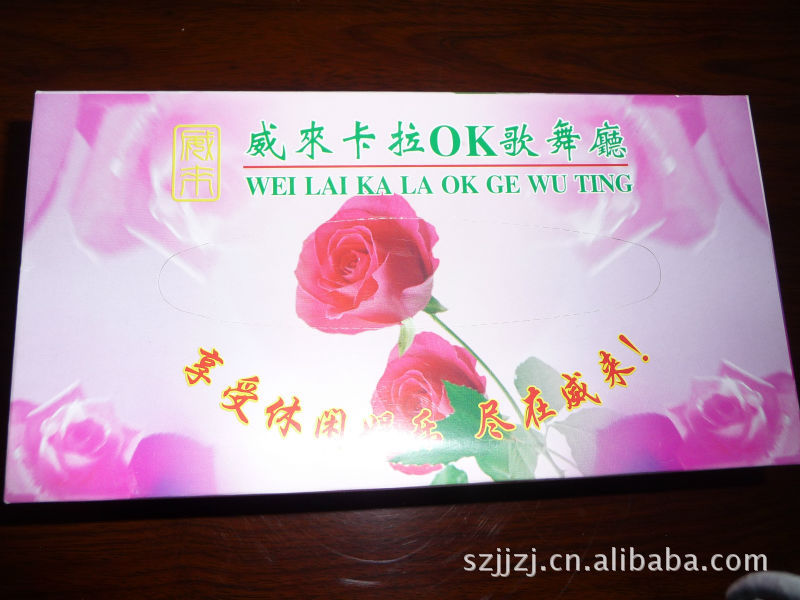 盒装抽纸,纸质:A纸,100%进口纯木桨(维达纸),纸巾规格:18*20cm 30-60抽;纸盒规格:10.5*10.5*10.5,纸盒材质:350g过油磨光处理;包装规格:110盒左右/盒,用于各类大酒店、餐厅、KTV休闲娱乐场所等。