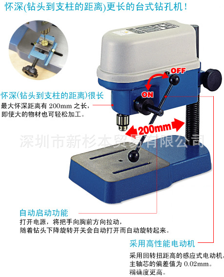 ●怀深(钻头到支柱的距离)为台式中最长级别。(200mm)