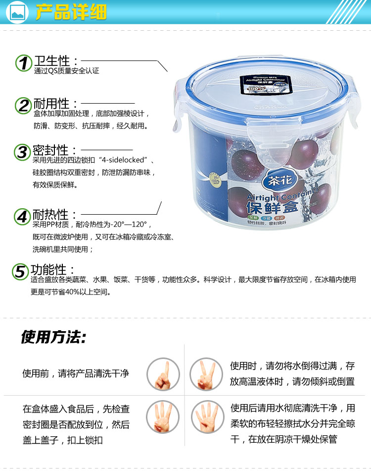 品牌 | 茶花 | 品名 | 保鲜盒 | 材质 | PP、硅胶 | 型号 | 3029 | 规格 | 11.5*8.2CM | 容量 | 420ML | |  |
