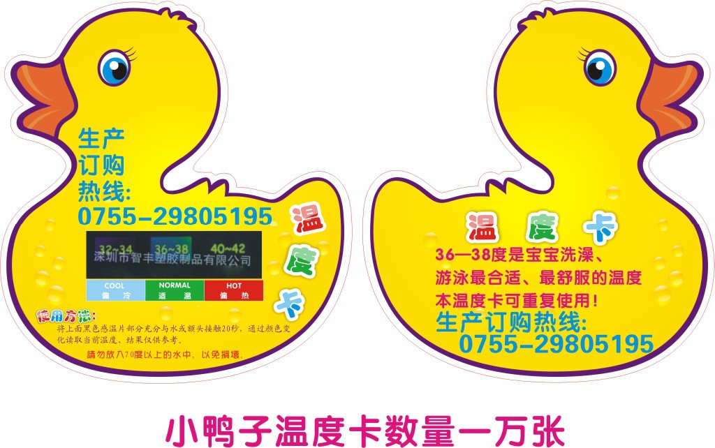 最流行火爆的是小鸭子水温测试卡类;刚开始接触小鸭子水温测试卡类有很多人并不了解,也有抱怀疑的想法。以为只有温度计才能测温度。事实上:小鸭子洗澡水温测试卡类它不单单是一张普通的卡片,除了正反卡面上可以任意设计印刷各种品牌LOGO、广告图文外。还含带有水温测试功能: