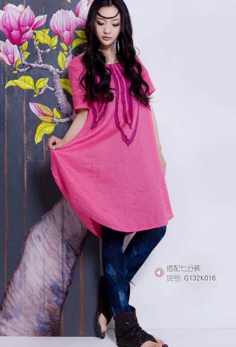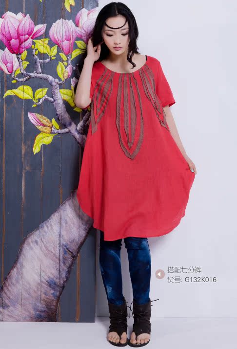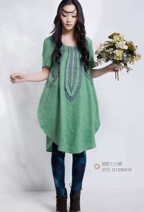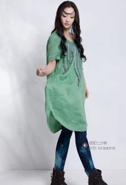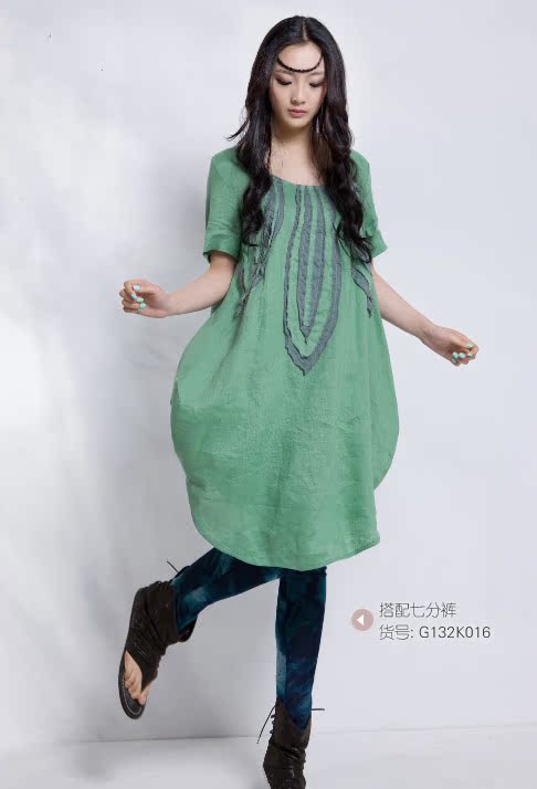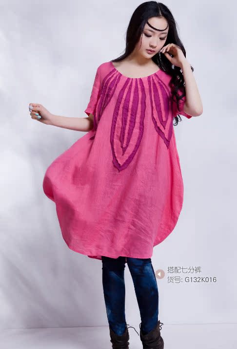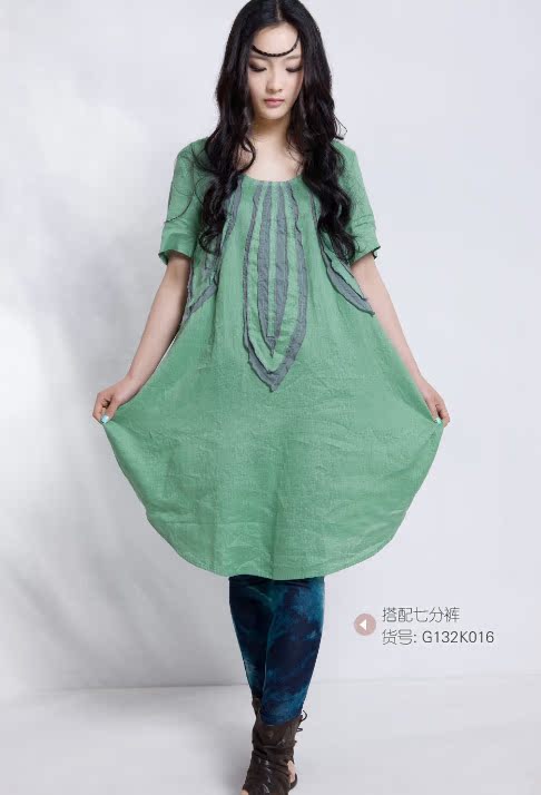 吉丘古儿怒放2013甜美连衣裙夏短袖圆领棉麻长裙拼接大码显瘦女装