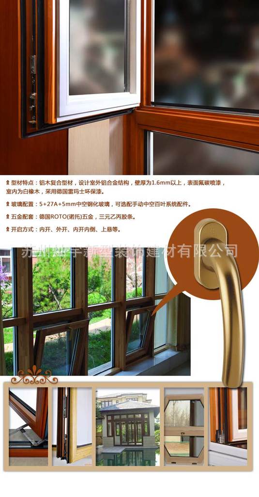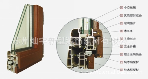1、该窗集合铝合金特有性能和木材的自然美浑然一体,既具有电泳或喷涂铝材的耐久性、高强度、 耐