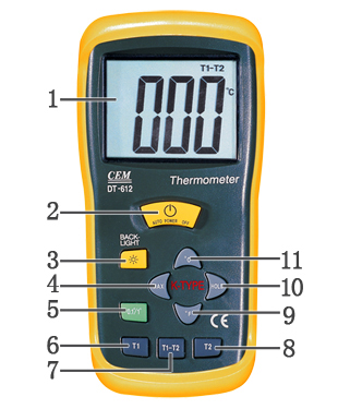 1.液晶显示屏 2.电源开关键 3.背光源按键 4.最大值保持键 5.分辨率选择键 6.单温T1键 7.双温T1-T2温差键 8.单温T2键 9.℉单位选择键 10.数据保持键 11.℃单位选择键