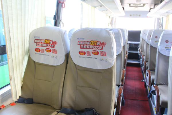 省际市际客车班车座椅半截卫生头套印刷广告,针对当地客运线路,覆盖面积广,针对性强,比影视广告更适合的当地宣传手段!比如:地产楼盘广告、银行广告、珠宝专卖店广告、商场促销广告、培训机构宣传广告、私立学校广告、婚纱摄影婚庆公司广告、医院广告、商品广告、保险广告、移动联通电信套餐广告、、、、把需要的广告内容(电话及地址优惠项目相关优势等内容)印在汽车客车座椅的白色头枕套帽上,此类宣传方式一般用于市县公交客运旅游车辆,是目前广告市场最合适的推广宣传方式之一,印刷内容客户可随意定制!客户群针对性强,资金投入少,收益大,是您理想的宣传广告方式!本公司属于专业生产制作厂家,采用的布料材质弹性大、厚实不虚边、耐磨易清洗等优势。为最佳的广告头套材质!欢迎您来电详谈。