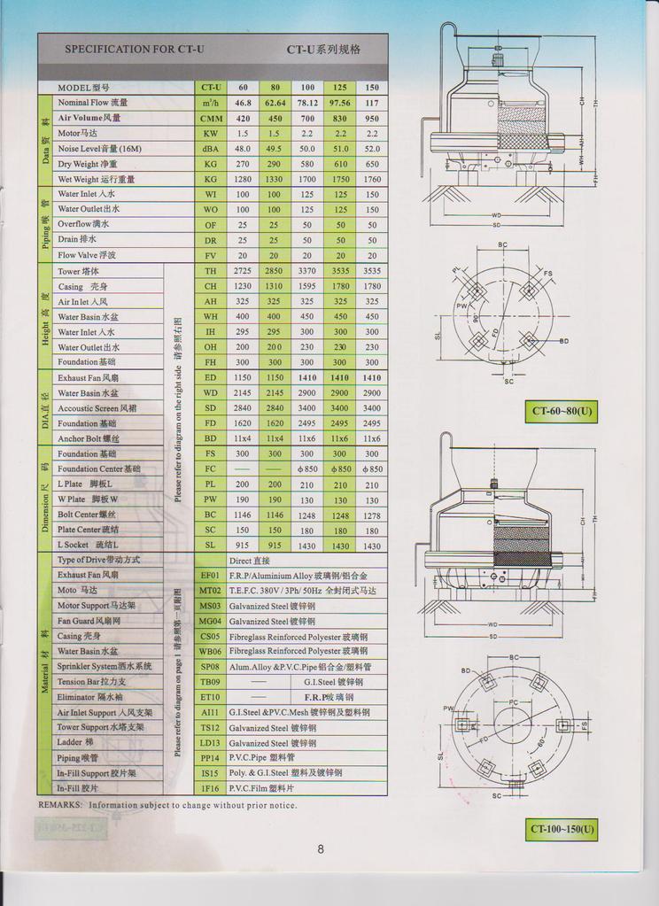 菱电CT系列冷却水塔计3个型号,分别为标准型、低噪声型、超低噪声型。每种型号又分别有几十种规格,可满足不同水塔水量及不同用途的客户的使用要求。