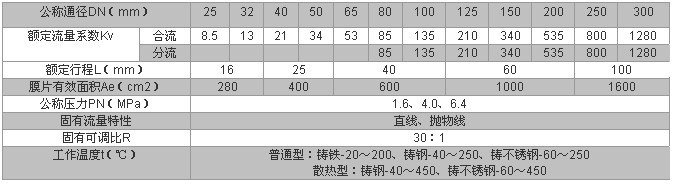 气动三通调节阀有三通合流及三通分流两种。公称压力有PN16、40、64;公称通径范围DN25~300。适用流体温度由-60℃至+450℃。泄漏量标准为Ⅳ级。流量特性有直线、抛物线两种。