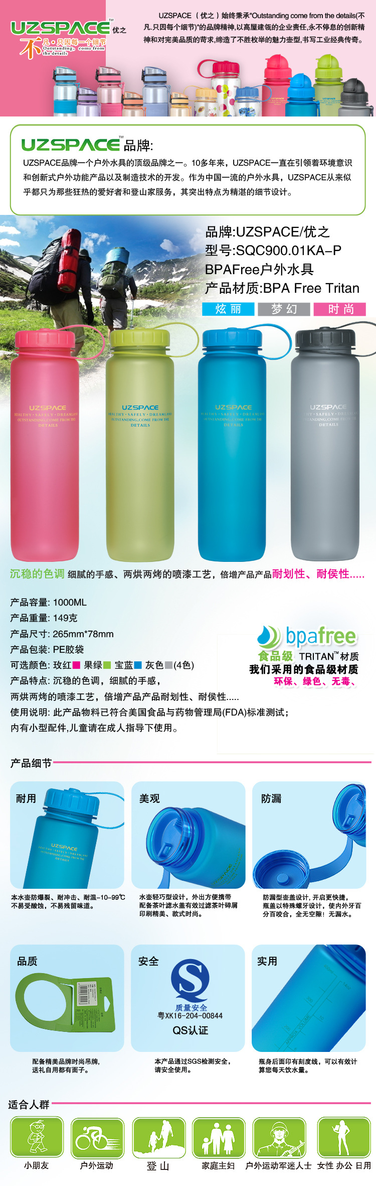 UZSPACE优之:UZSPACE品牌是一个户外水具的顶级品牌之一。10多年来,UZSPACE一直在引领着环境意识型和创新式户外功能产品以及制造技术的开发。作为中国一流的户外水具生产商,UZSPACE从来似乎都只为那些狂热的爱好者和登山家服务,其突出特点为精湛的细节设计。