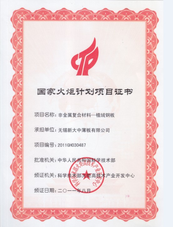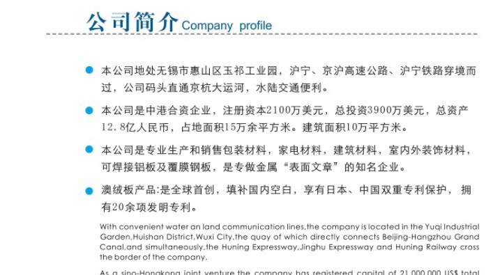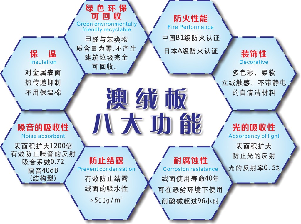 与钢板粘接的附着性能:玻璃纤维和无机保温材料贴在钢板上和植绒钢板作大气气暴露试验进行比较,前两种钢板附着材料经过一个月后附着物开始脱落。植绒钢板经过2年后也没发生异样。Sticking fiber glass and anic warm keeping material on steel and flocking steel to do an atmospheric climate exposure test, the former two attaching materials on steel will drop down after one month,but flcking steel has no difference after two years.