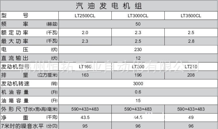 型号 LT3000CL频率 50HZ 额定功率 2.3KW最大功率 2.5KW电压 230V直流输出 12V发动机型号 LT200排量 196立方厘米发动机转速 3000转机油容量 0.6升油箱容量 15升外形尺寸 590*433*483mm净重 44.5千克7米时的噪音水平95分贝