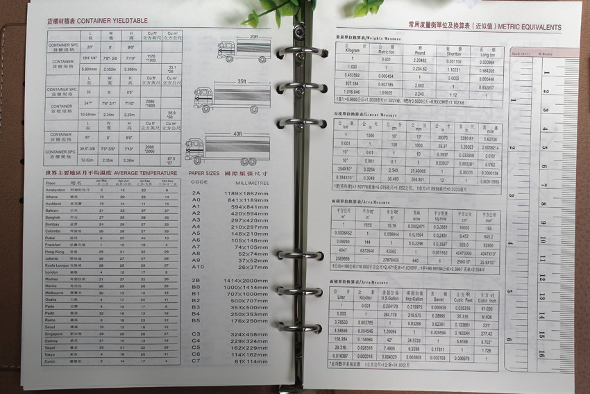 货柜材积表、度量衡换算表、国内轨道线路图、年度计划表、通讯录。