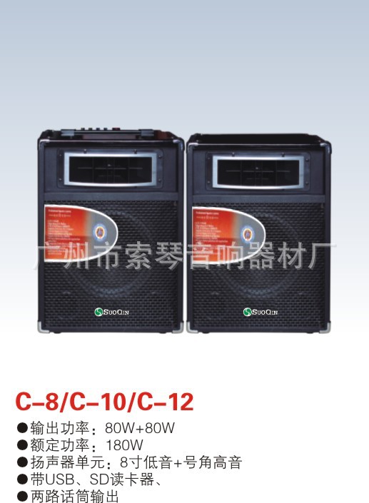 120W+120W,大功率顶部烤漆带USB/SD接口,电镀白金包角,前面铁网喷漆,箱体黑色材质,10寸*2+号角高音*2