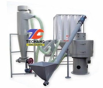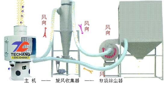 微细粉物料经进料斗流入进料口,立即扩散并与空气混合成雾状,经旋转风轮的作用,呈旋风状喷射过网,过网后的细粉经振动输送进入或直接落入负压循环风道,在引风机的作用下,气体与细粉全部进入沉降室,成品细粉沉降后由下部的排料绞龙排出,带有少量料粉尘的气体大部进入除尘布袋,经净化后排出袋外,还有一小部分,由回风管进入筛体下的环形循环风道,再经引风机进入沉降室进行二次分离。