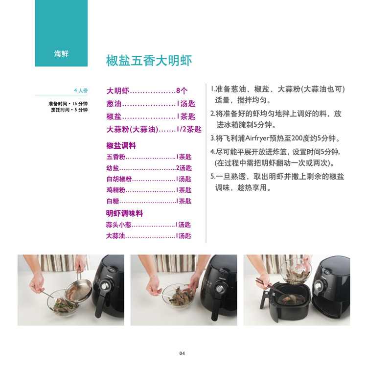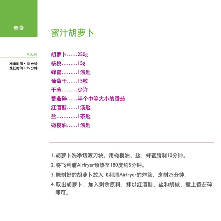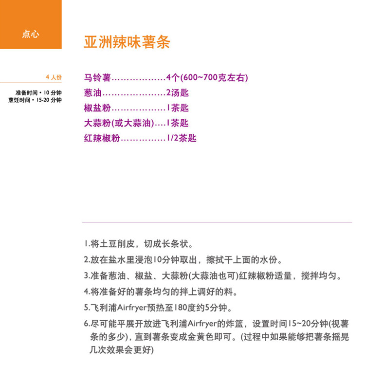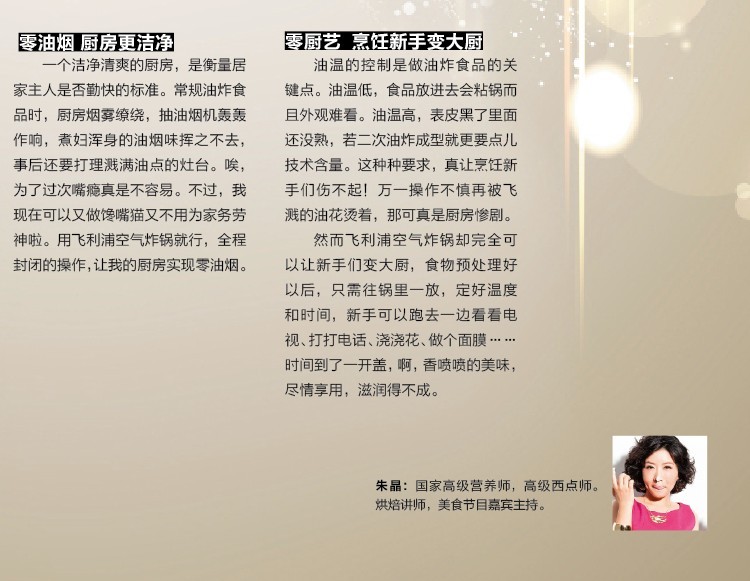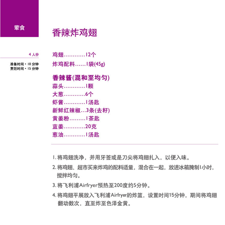 | 30 分钟计时器 集成计时器可让您将烹饪时间预设长达 30分钟。自动关闭功能包括“ 就绪” 声音指 示灯。 | |  | 美味食谱 AirFryer 空气炸锅随附由烹饪专家针对中国市场量身定制的创新美味食谱,包括15 道针对肉类、海鲜、蔬菜等分类的创新菜肴和小食,每道菜肴都包括简单易读的指导,烹饪技巧以及营养健康提示。使用 AirFryer空气炸锅,用美味可口的食品打造一场健康华美的饕餮盛宴! |