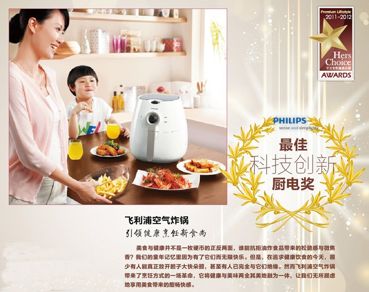 用空气“ 煎炸” 食物,轻松尽享健康美味! * 绝美效果源于高速空气循环技术 飞利浦创新厨房家电“AirFryer”在欧洲,新加坡,韩国 ,马来西亚等各国上市获得巨大成功,现在来到中国! AirFryer 空气炸锅的专利高速空气循环技术让您可以做出脂肪量至多可降低 80% 的美味炸薯条!以健康快速的方式,享用美味炸薯条、小吃和正餐。更少油烟味,更易清洁!