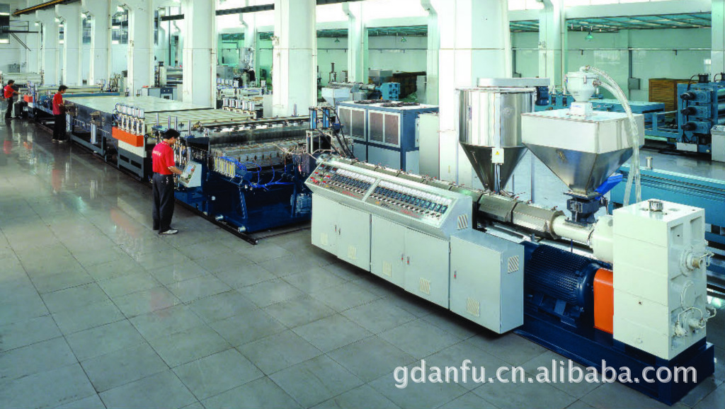 2.中空板押出系统,特殊的螺杆结构,元件的设置及技术参数的控制,精确的控温系统和调速成系统的安装,确保了塑料原料的塑化良好和稳定押出。