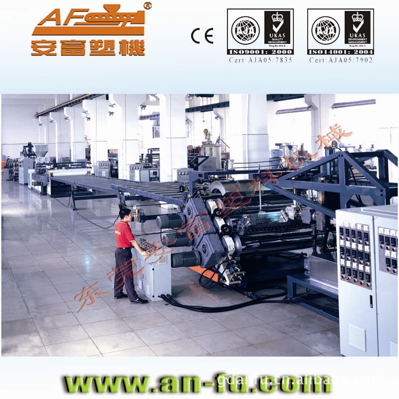 安富生产的中空板设备,采用不同的螺杆设计及机械配置,可生产多种规格的PC、PP中空板,可生产的最大宽度为2300mm,厚度从2mm-12mm。此产品广泛用于广告、装饰、隔音、包装等用途,并且因PP中空板具有质轻、强度高、防潮、防腐等优点,已逐步代替了纸箱,成为做包装箱的首选材料。