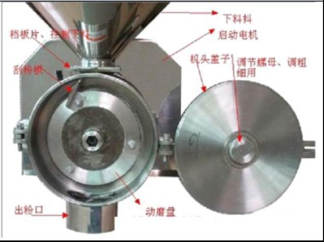 (二)该磨粉机靠两块布满齿槽的磨盘对磨运转从而将物料磨成粉末。该机属连续投料式作业,结构简单大方,噪音小,容易操作,粉碎细腻,无粉尘;