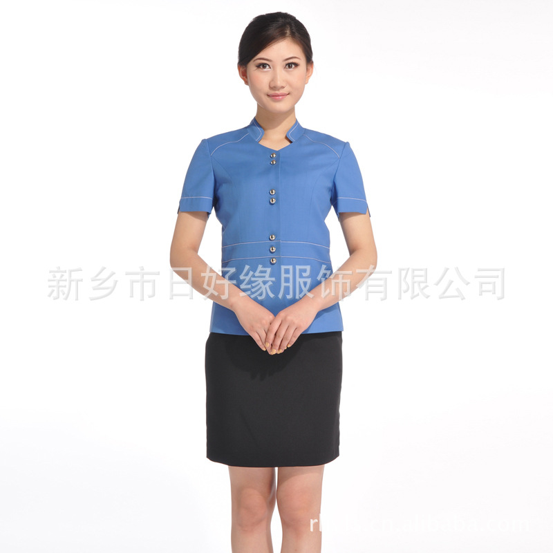 日好缘服装供应夏季新款蓝色短袖职业装 女款酒店服装