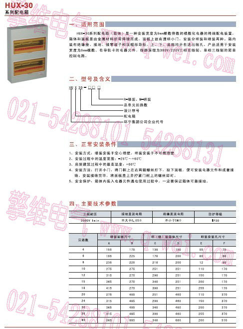 环宇低压电器-环宇低压配电箱:HUX30系列配电箱是一种安装宽度为9mm整数倍数的模数化电器的终端配电装置,箱体和面板是由金属材料折弯焊接而成,面板上嵌有透明小门,安装分明装和暗装两种。箱内装有绝缘座、接地、接零端子和顶帽形导轨,上、下、底部均开有进出线孔。产品适用于安装宽度为9mm模数、有导轨卡的电器元件,线路原理为380V/220V三相五线制、单相三线制的控制电路中。
