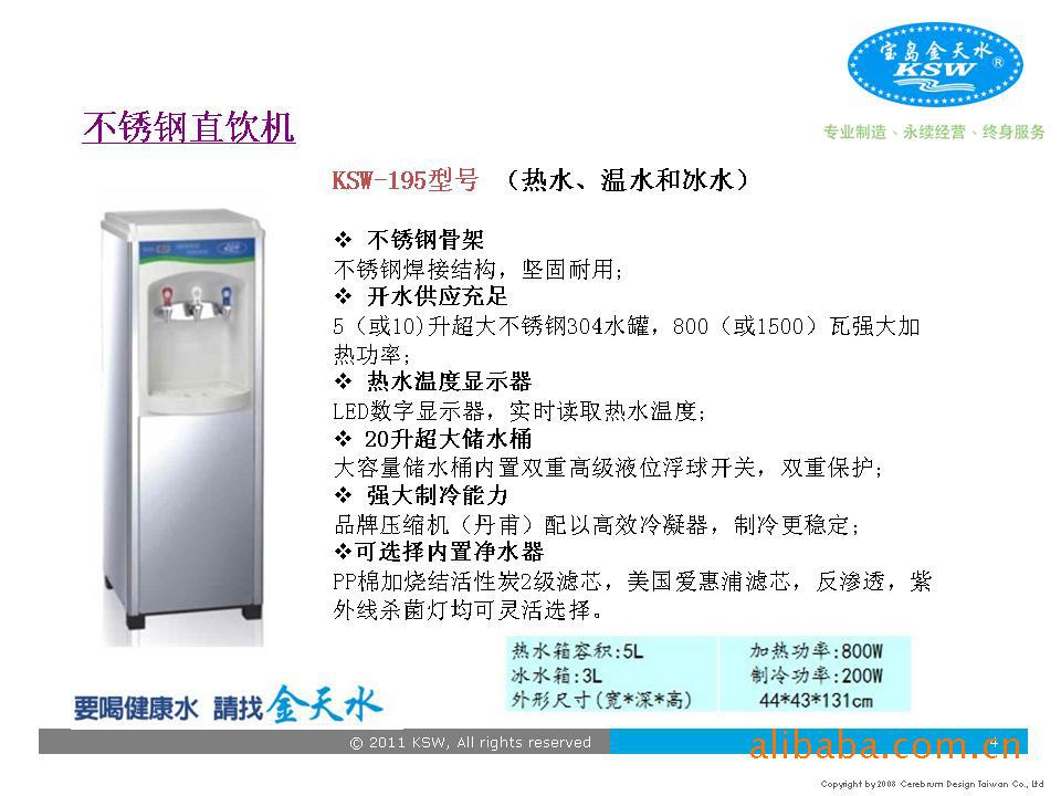 宁波金天水机电有限公司是专业生产自来水直饮水机及净水设备的台商独资企业,是直饮机饮用水设备设计、开发、生产及销售于一体的专业制造商。“金天水”企业宗旨是以严谨的制程、科学的管理、专业的技术、贴心的服务、保证你喝上安心、健康又实惠的好水。