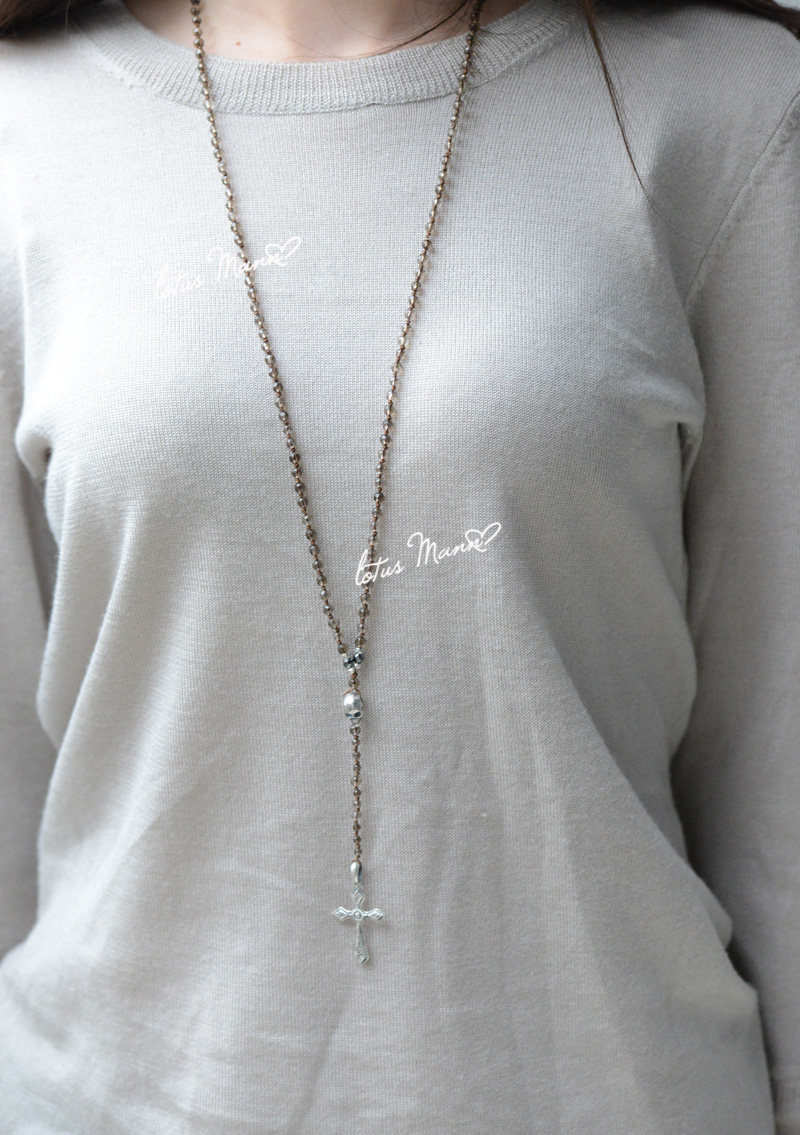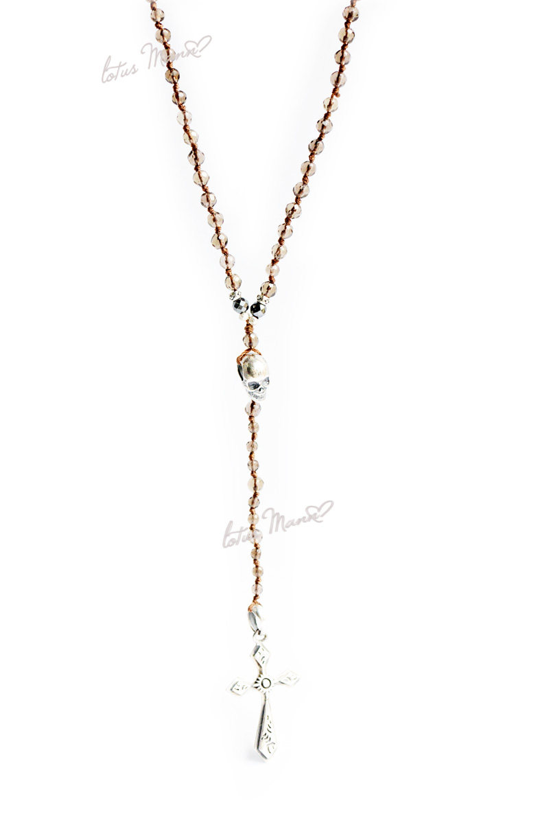 Layering rosary style necklace with smokey semi precious stones and sterling silver skull and cross pendant