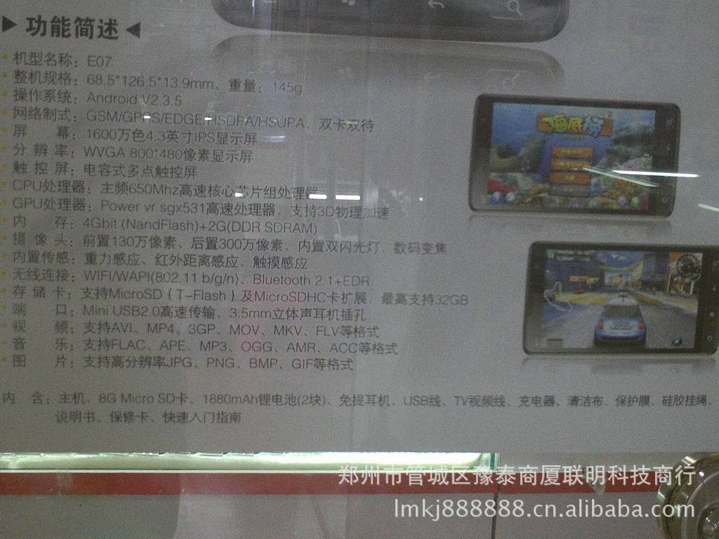 【机型名称】 | 【Windows 8wifi版】E07 | 【整 机 规 格】 | 68.5*126.5*13.9MM重量:145K | 【操作系统】 | Android V2.3.5 | 【网络制式】 | GSM/GPRS/EDGE/HSDPA/HSUPA/双卡手机 | 【屏幕】 | 1600万色4.3英寸ips显示屏 | 【分辨率】 | WVGA 800*480像素显示屏 | 【触 控 屏】 | 电容式多点触控屏 | CPU处理器 | 主频650MHZ高速核心芯片组处理器 | GPU处理器 | Power vr SGX 531高速处理器。支持3D物理加速 | 【内存】 | 4GBIT<NAND FLASH>+2G <DDR SDRAM> | 【摄像头】 | 130万前 300万后摄像头内置双闪光灯。数码变焦 | 【内置传感】 | 重力感应,红外距离感应,触摸感应 | 【无线连接】 | Wifi/WAPi<802.11 b/g/n>,blutetooth 2.1+EDR | 【存储卡】 | 支持MicroSD<T-FLASH>及microSDHC扩展卡,最高支持32GB | 【端口】 | MINI USB2.0高速传输, 3.5MM立体声耳机插孔 | 【视频】 | 支持AVI,MP4,3GP,MOV,MKV,FLV等格式 | 【音乐】 | 支持FLAC,APE,MP3,OGG,AMR,ACC等格式 | 【图片】 | 支持高分辨率JPG,PNG,BMP,GIF等格式 | 【待机时长】 | 650小时*视具体网络环境而定 | 【通话时长】 | 780分钟+*视具体网络环境而定 |