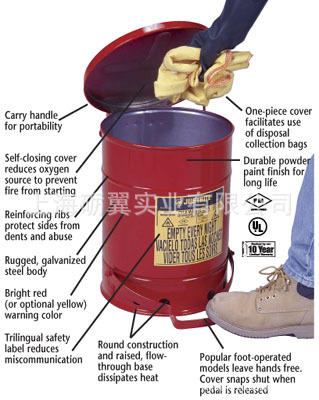美国Justrite09100,带脚踏盖防火垃圾桶,有FM、UL认证,十年质保