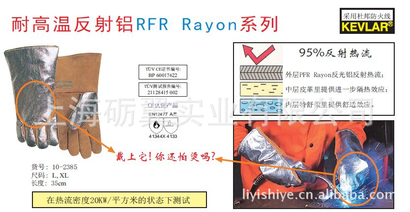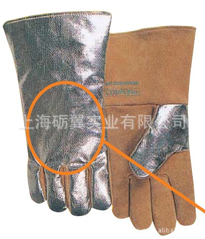 手套长35cm,采用高拉力、阻燃的杜邦Kevlar 4线防火线缝制,阻燃布袖内层。 该手套适用于高热流环境下进行烧焊工作。反射铝层具有防火阻燃和反射热流作用,由反光铝箔PFR Rayon制成,能反射95%的热流。手掌用舒适耐用的牛二层芯皮制成