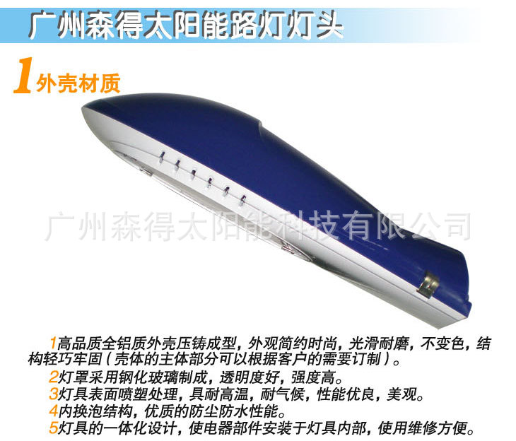 1:全新设计的高品质全铝质路灯外壳,外观简约时尚,外表采用阳极氧化、散热装置与灯壳一体化设计,耐腐散热性能良好。该型材散面积大,外型结构美观,防水好,灯体壳体的主体部分可以根据客户的需要订制。