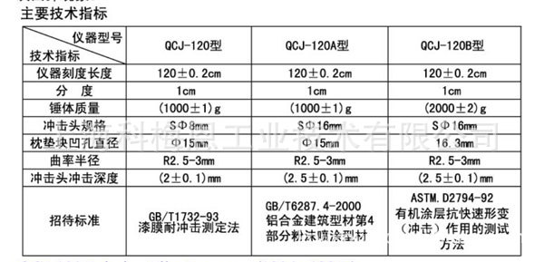 QCJ-120型漆膜冲击试验机详细介绍: QCJ -120系列漆膜冲击器用途:利用重物从高处落下,冲击铝合金、彩色钢板或钢带以测定涂层的耐冲击性能;以固定质量的重锤落于试板上而不引起漆膜破坏的最大高度,测定120 厘米表示的漆膜耐冲击性试验。本仪器冲击头冲击式板后,无二次回弹现象。 结构简述: 本冲击器共分四部分组成:1.底座 2.有刻度的管身 3.重锤 4.控制器