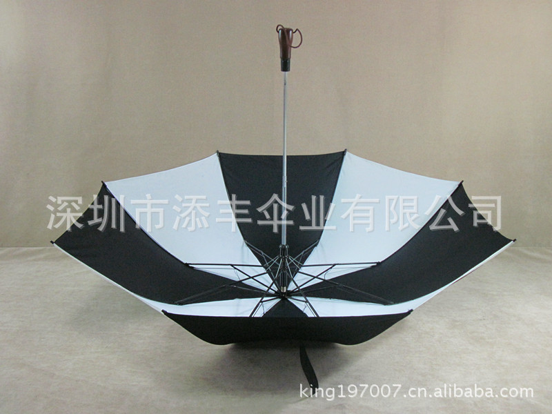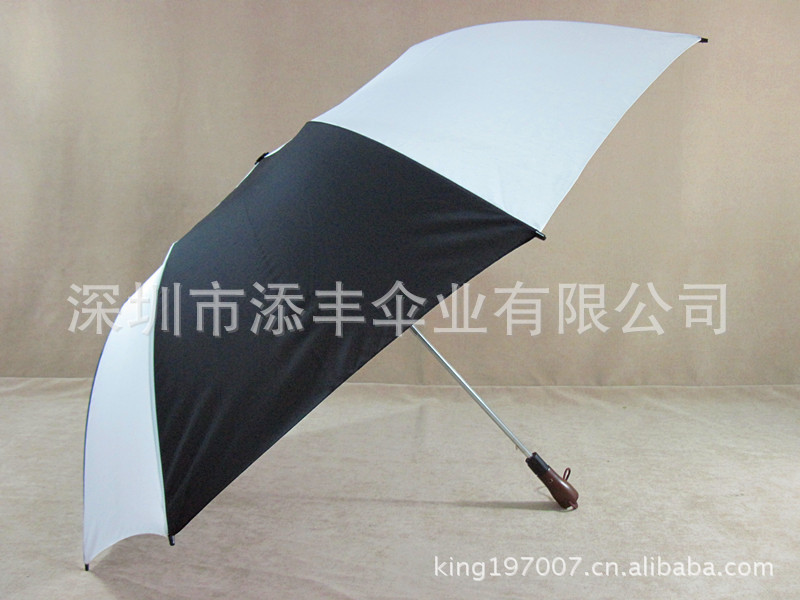 产品材质:27寸*8K两折自开电黑伞骨+电锌六角中棒+实木黑手柄+190T尼龙素色伞面