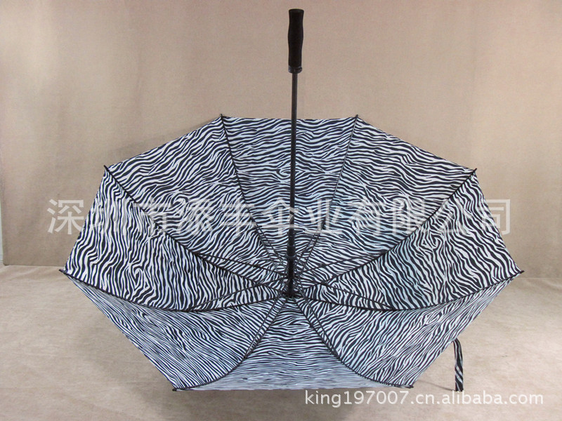 产品材质:27寸*8K全纤维伞骨+14厘铝合金电黑中棒+隐藏式圆形按钮开关+190T斑马纹印花碰织布+黑色EVA手柄+黑色塑胶喇叭尾